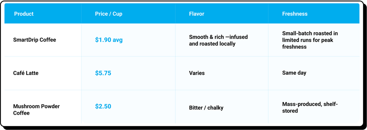 Each batch of SmartDrip Drip Mushroom Coffee is roasted and infused in small runs at a Southern California roastery — never mass-produced.